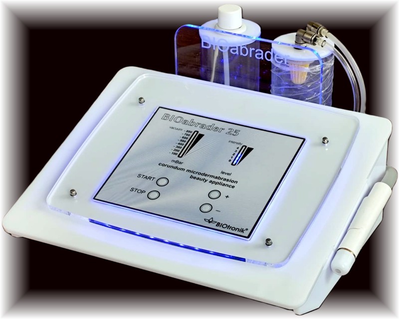 Mikrodermabrazja korundowa to nowoczesny, nieinwazyjny zabieg ścierania naskórka przy pomocy kryształków tlenku glinu, dający natychmiastowe efekty w postaci poprawy kondycji skóry. BIOabrader Ba-25 jest najnowszą, udoskonaloną wersją BIOabradera Ba-04a. Model ten posiada mikroprocesorowe precyzyjne sterowanie i ustawianie intensywności ścierania. Jednocześnie poprawiono i ulepszono konstrukcję pojemników na korund. Delikatne, niebieskie podświetlenie aparatu stwarza miłe wrażenie z lekka dozą tajemniczości czynionego zabiegu...